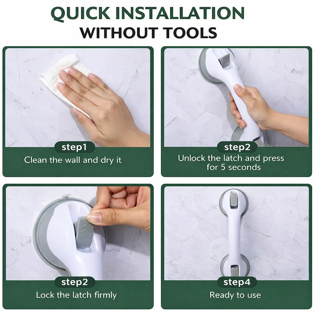 Vi præsenterer Beyondsikker™ Secure Handle Bar. Det sikre håndtag, der giver solid støtte, når du har mest brug for det. Dette innovative håndtag er udstyret med et kraftigt sugekop-monteringssystem og kan nemt monteres på alle glatte overflader