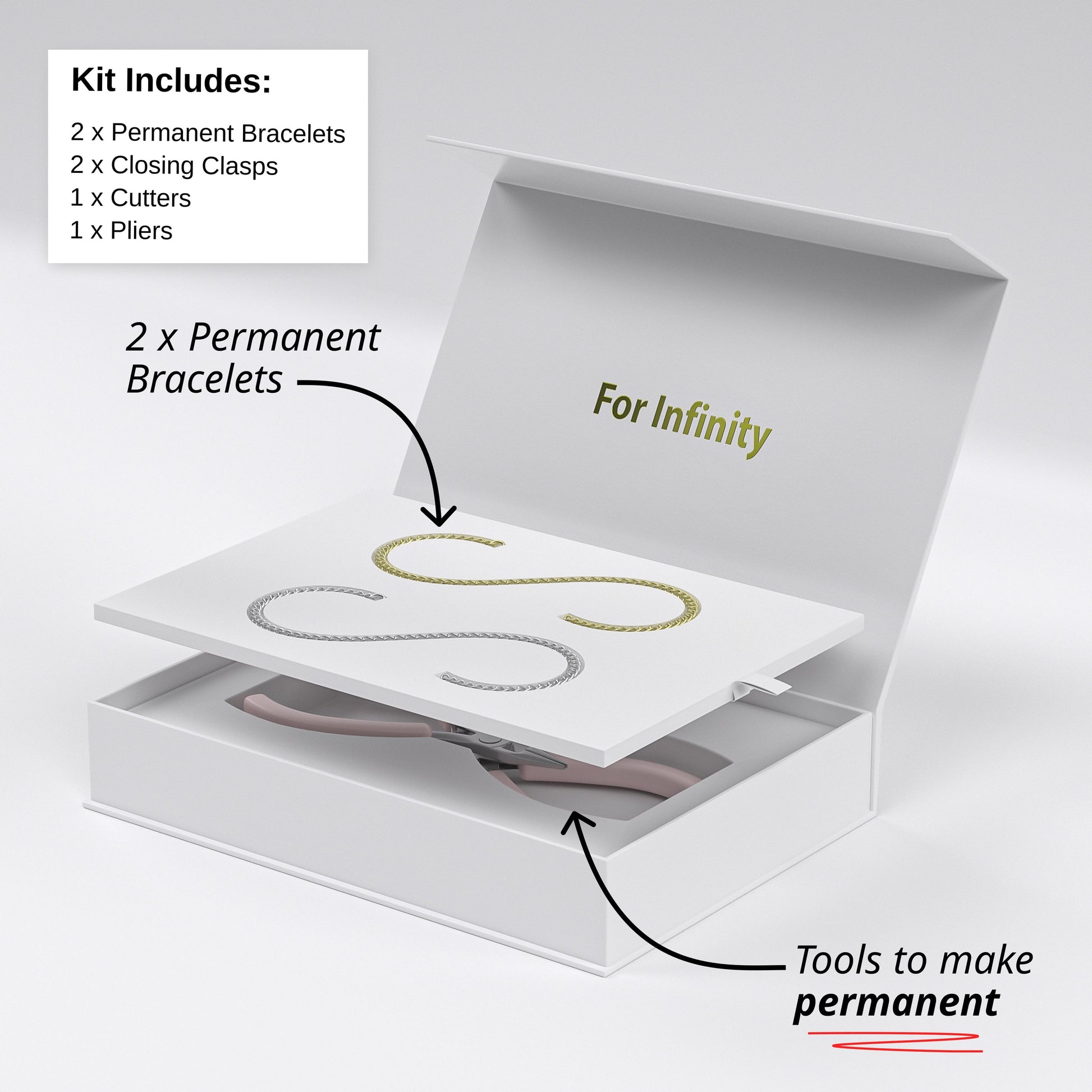 SWAVEO™ er designet til at indeholde alt, hvad du behøver for at lave dine permanente armbånd derhjemme. Det kan gøres i 3 nemme trin: