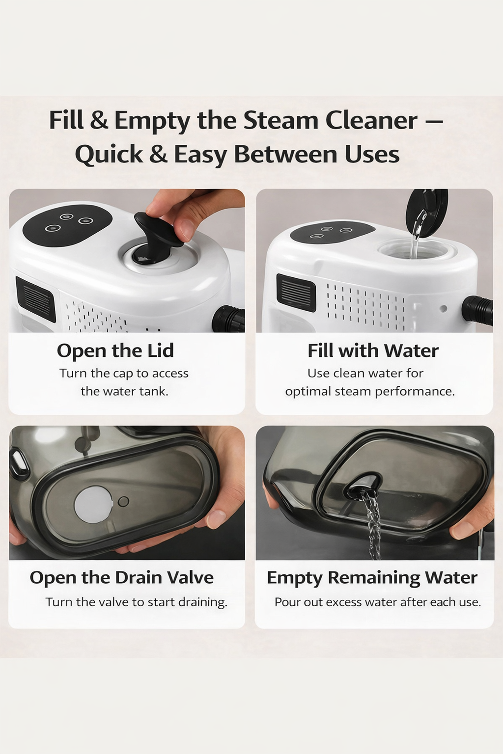 KvikkSteam™ använder endast vatten – inga starka kemikalier. Håll munstycket på säkert avstånd och undvik att använda ånga under längre tid på känsliga material. Låt ytorna svalna innan du rör vid dem.